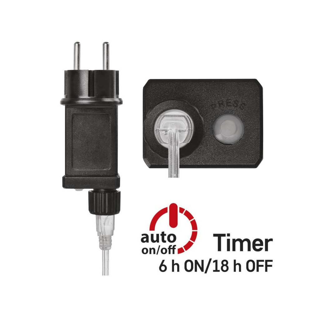 Il timer integrato 6h ON / 18h OFF gestisce tutto automaticamente. Funzionamento: colleghi la spina, accendi l'interruttore del controller all'orario desiderato (esempio ore 18:00), il sistema memorizza e replica il ciclo ogni giorno. Alle 18:00 la catena nano LED 100 si accende automaticamente, alle 24:00 si spegne da sola. Per settimane consecutive. Non devi ricordare nulla, non sprechi energia lasciandola accesa tutta notte. Per reimpostare il timer su un nuovo orario basta spegnere il controller per alcuni secondi e riaccenderlo all'orario nuovo: il sistema aggiorna la memoria e riparte dal nuovo ciclo. Alimentazione diretta 230V AC tramite trasformatore incluso (output 31V DC): niente batterie da sostituire, niente costi ricorrenti.